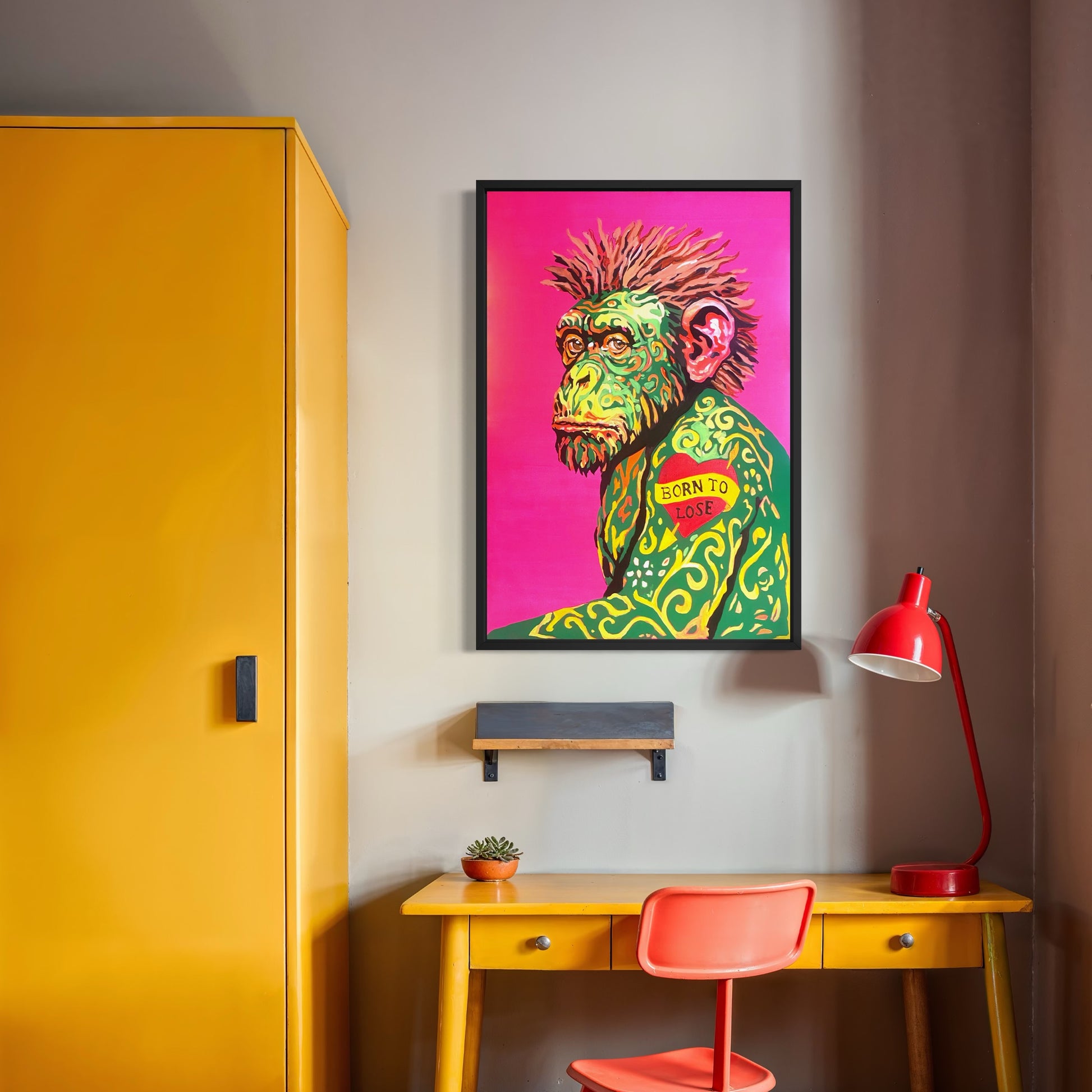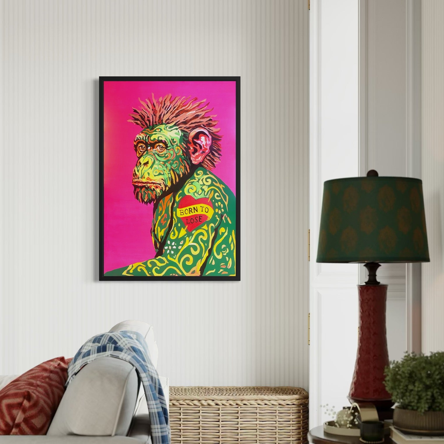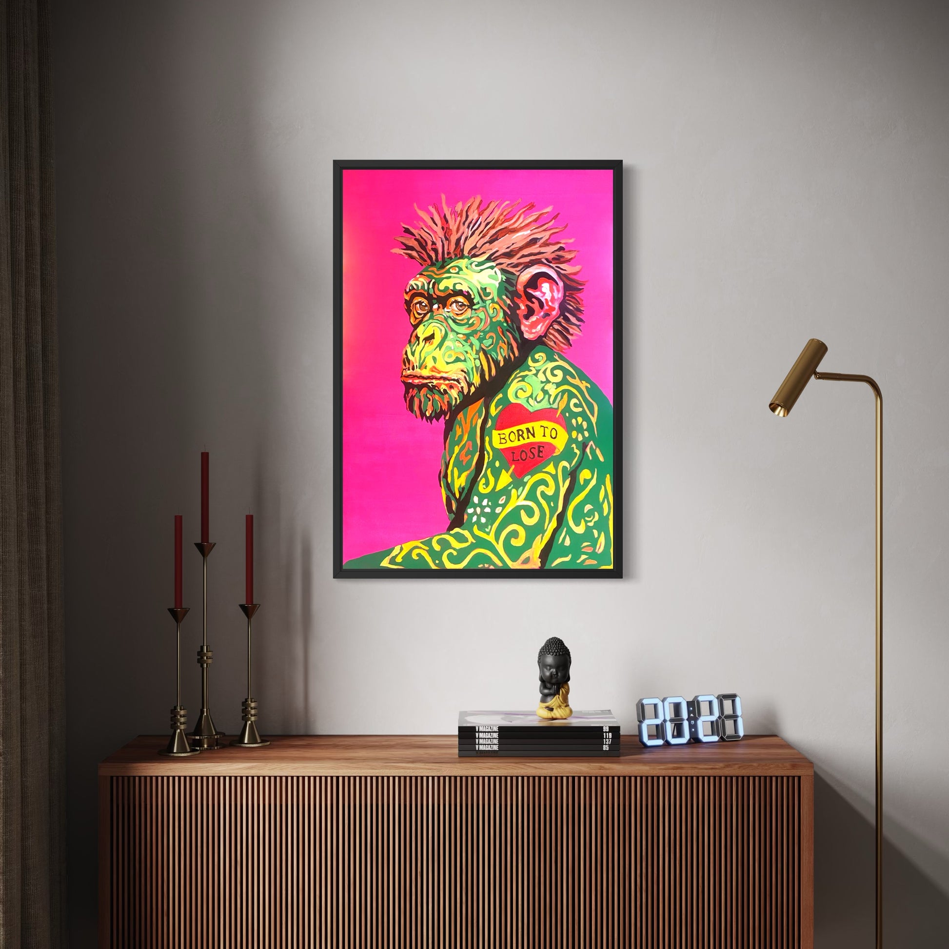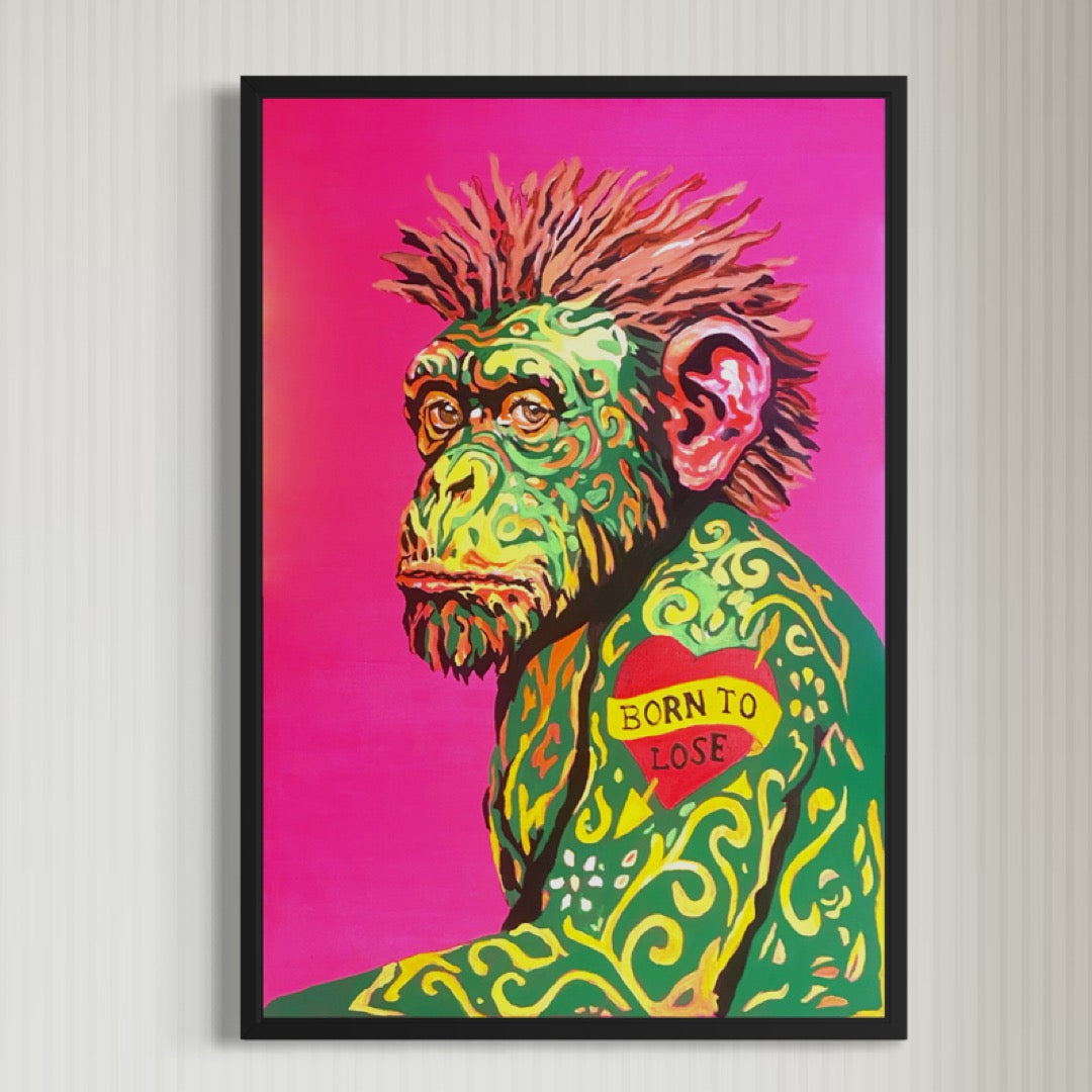 Bak det trettende blikket skjuler det seg en stille trass, en som har tapt nok ganger til å forstå hva seier egentlig betyr. De sterke kontrastene mellom grønt og rosa symboliserer kamp og livskraft, håp midt i sårbarheten. Hjertet bærer tatoveringen Born to Lose, men blikket avslører sannheten bak tittelen: viljen til å reise seg igjen, gang på gang.