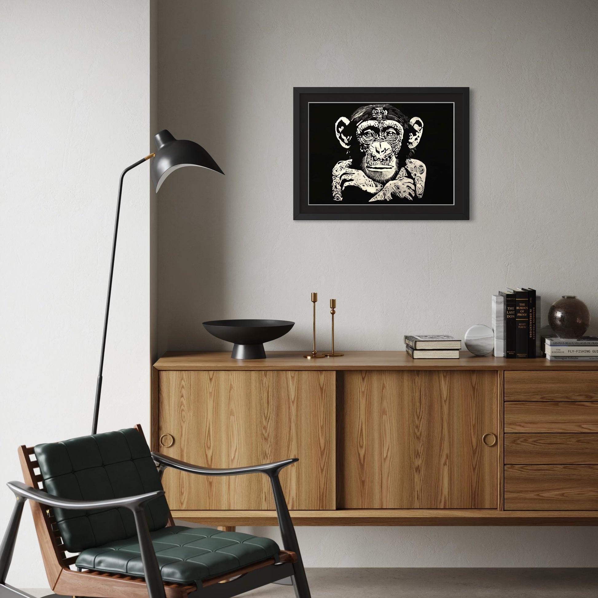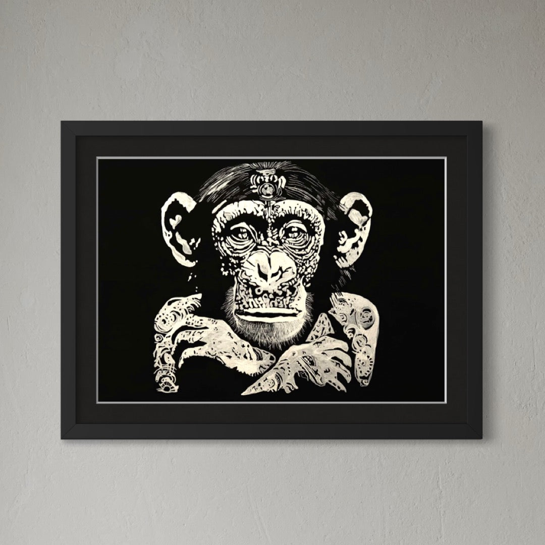 I Eternal Embrace møter vi en ape som sitter i dyp stillhet, med armene tett foldet rundt seg selv, som i en gest av selvbeskyttelse, ro eller indre aksept. Apen fremstår som en skulptur fryst i tid, løsrevet fra bevegelse og omgitt av et mørke som fremhever dens monumentale ro. De intrikate mønstrene på kropp og ansikt, sammen med symbolet i pannen, gir en følelse av tidløs visdom og åndelig nærvær. Dette er ikke bare et portrett, men en evig tilstand – en stille hyllest til kraften i å finne fred i seg selv.